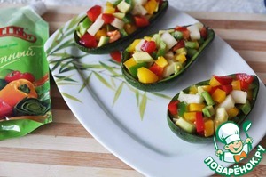 Для приготовления трёх порций закуски достаточно половины плода авокадо, остальное использовала для другого салата.