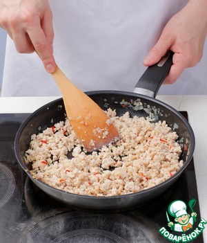 Лук очистить и измельчить. Перчики чили разрезать пополам и удалить семена, мякоть мелко нарезать. В разогретом масле обжарить лук и чили, 4 мин. Добавить фарш и готовить, постоянно помешивая и разминая комки, 10 мин. Снять с огня.