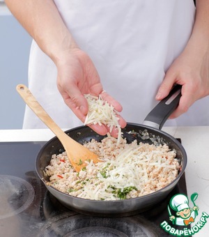 Кинзу вымыть, обсушить и измельчить. Сыр натереть на терке. Добавить зелень и сыр к фаршу, перемешать.