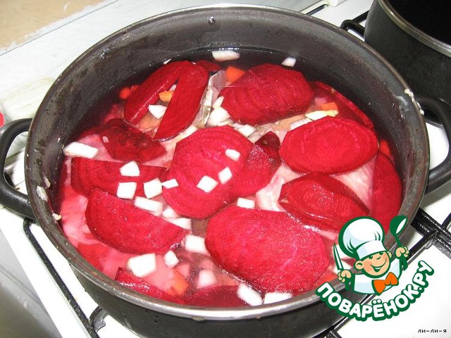 Взять большую кастрюлю с плоским дном. Свеклу очистить, нарезать пластинками, уложить одним слоем на дно. Затем рыбу аккуратно положить на свеклу. Кости тоже положить. Лук и морковь мелко порезать и покрыть рыбу. А сверху еще свеклу. Залить холодной водой. Когда закипит, посолить и поперчить по вкусу.