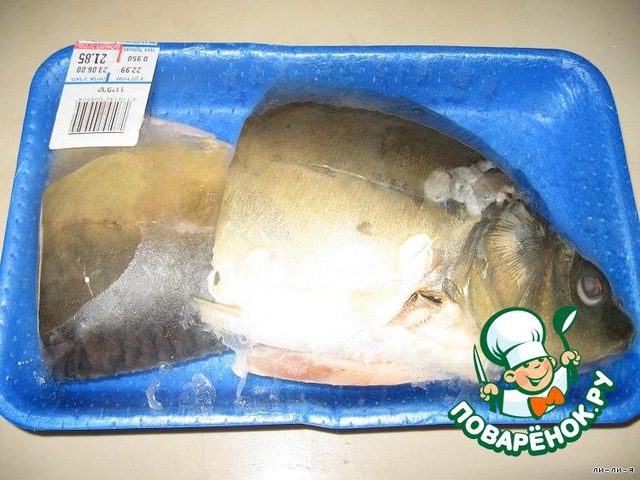 Я купила карп весом 1кг., очищенный, но разрезанный на 2 части. Поэтому, буду готовить из того, что есть.
