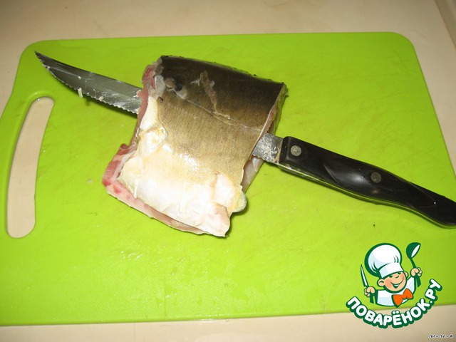 Если рыба целая, ее надо почистить от чешуи, срезать плавники, разрезать живот, выпотрошить, отрезать голову, вынуть жабры и глаза, вымыть и нарезать на куски по 6-7см.