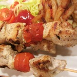 • Помидоры вымыть. Филе вынуть из маринада, промокнуть салфетками. Надеть кусочки курицы и помидорки поочередно на 4 шампура и обжарить на мангале по 12-15 мин. Подать шашлыки горячими вместе с кетчупом.