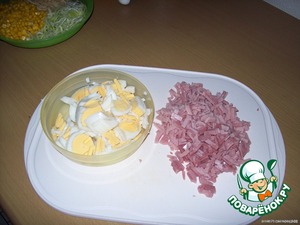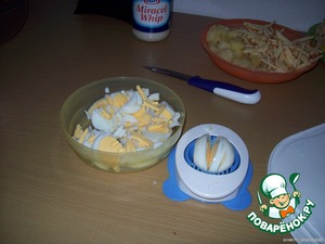 Яйца отварить вкрутую, остудить и порезать кубиками,я резала на яйцерезке.