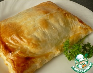 Слоёное тесто свернуть конвертиком и украсить края по вашему желанию. Забыла показать, что можно делать поперёк 4-5 надрезов. Смазать верх яичным желтком.