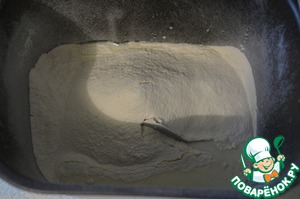 В ведерко хлебопечки влить теплую сыворотку (150 мл.) добавить дрожжи и оставить на 5 минут.
