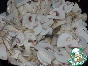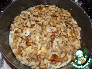Пока жарятся грибы, делаем картофельное тесто: к мятому картофелю добавляем соль, перец, мускатный орех и яйца... Все перемешиваем.