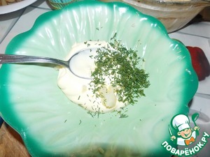 Затем в майонез добавляем чеснок и укроп. И перемешиваем. Это будет соус.
