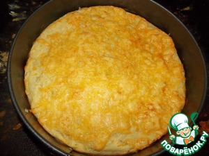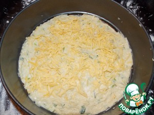 1 слоем выкладываем половину картофельного теста и сверху натрем половину сыра.