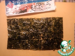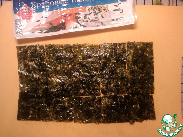 Кладём лист нори на циновку. У меня циновки нет, но есть гибкая доска, которой вполне хватает.