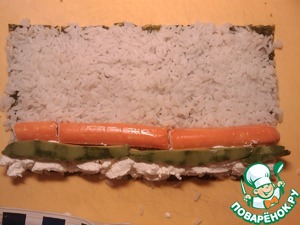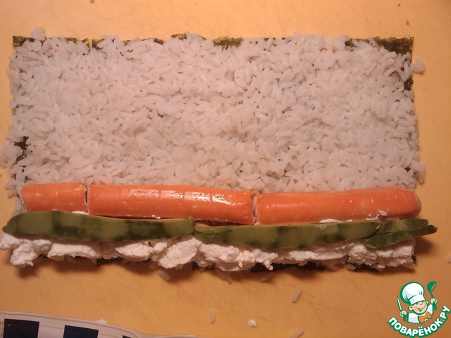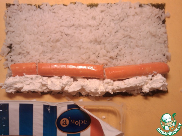 Выкладываем рис на лист нори тонким слоем (0,5 см). Кладём с одного края крабовые палочки, творожный сыр