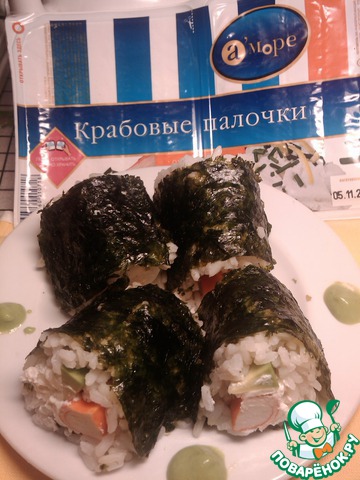 Подавать с васаби, соевым соусом и маринованным имбирём)