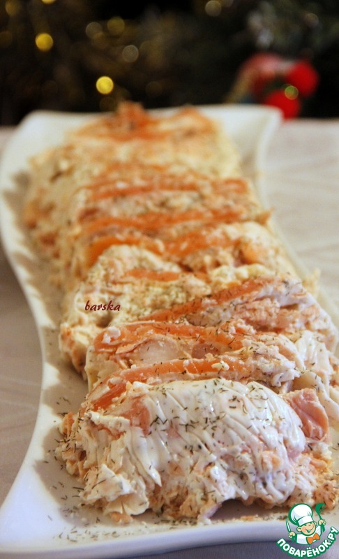 [+4]В дальнейшем планирую кое-что менять: добавлю внутрь сливочный хрен вместо майонеза и буду мелко резать креветки или совсем без оных. Нарезка - убийственная, сорри