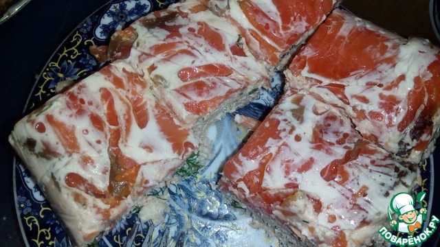 А пока берем подходящую форму (у меня все та же пластиковая форма от какого-то покупного печенья) и выкладываем на дно тонкие пластинки копченой красной рыбы. Если паштет будете делать в негибкой форме, обязательно застелите пищевой пленкой, чтобы потом можно было быстро и красиво извлечь паштет из формы.