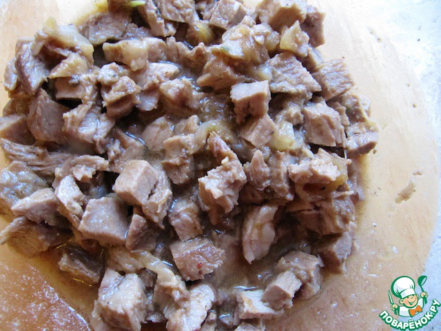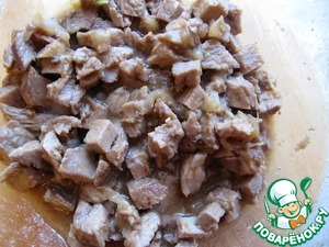 • Мясо разделить/разрезать на волокна произвольными небольшими кусочками, печеные лук и чеснок размять вилкой, добавить мясной сок, перемешать.