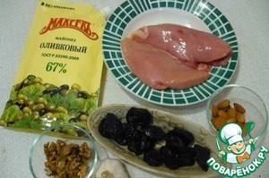Миндаль и грецкие орехи измельчить в некрупную крошку. Добавить измельченный чеснок и 2 ст. л. майонеза. Чернослив промыть и залить кипятком до мягкости.