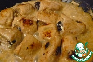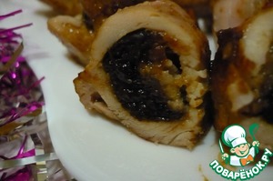 Филе нарезать на небольшими кусочки, сделать прорезы в середине, делая сквозную дырку. Посолить и вставить нафаршированный чернослив вовнутрь. Если он большой, то разрежьте чернослив пополам вдоль. Обжарьте рулетики на горячем масле с 2 сторон.