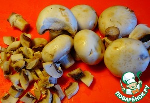 Жареные грибочки разделить пополам и положить отдельно к курице и к ветчине. А можно и всё вместе смешать, если вера позволяет.