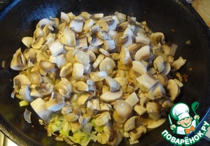 Разогреть в сковороде растительное масло. Обжарить на нём сначала лук, а потом грибы.