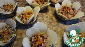 Лепестки из картошки нужно смазать майонезом и уложить в формочки внахлёст.