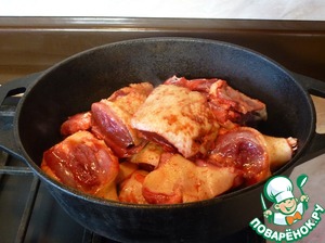Разрезать гуся на порционные кусочки, натереть маринадом и отправить в холодильник на сутки.