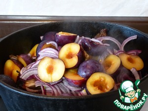 По истечении двух часов в казан к гусю добавить сливы и лук, немного посолить и тушить еще около 15 минут, следите, чтобы сливы не раскисли. У меня были очень плотные сливы.