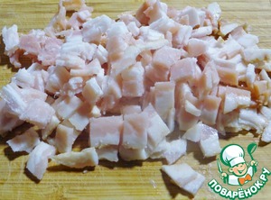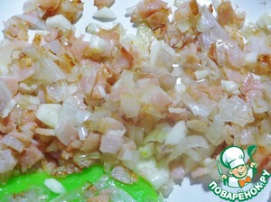 На сковороде слегка обжарить бекон с луком, затем добавить чеснок.