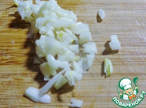 Чеснок раздавить плоской стороной ножа, затем мелко нарезать.