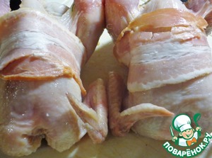Обернуть каждую беконом, скрепить зубочисткой и поместить в рукав для запекания.