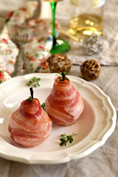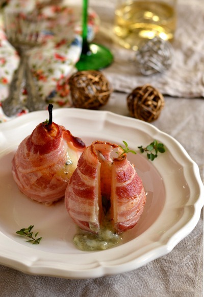 Предлагаю вам очень элегантное угощение, которое будет украшением любого праздничного стола. Груша, пошированная в белом вине, с начинкой из рокфора, запеченная в беконе. Даже при чтении названия разыгрывается аппетит.