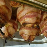 Каждую грушу аккуратно завернуть беконом. На одну грушу нужно 3 полоски бекона. Хорошо заверните низ груш, чтобы сыр не вытек при запекании. На грушу поставьте верхушку, чтобы было красивее. -
