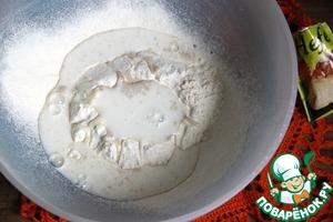 Просеять в миску муку, сделать воронку, всыпать пакетик дрожжей,