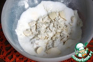 125 г масла хлопьями распределить по краям миски и посыпать 30 г сахара. Накрыть миску плёнкой и оставить для подъёма в тёплом месте на 15-20 мин.