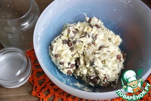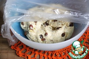 Вмесить в тесто настоявшиеся фрукты и орехи, тесто надрезать крестообразно.