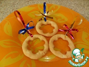 Раскатать тесто толщиной 5 мм, при помощи формочек вырезать печенье, сделать фигурные прорези посередине. Сделать маленькое отверстие для ленточки.