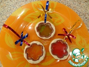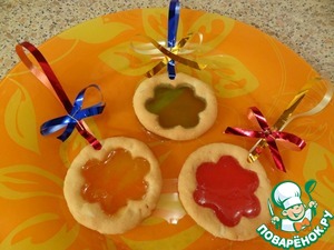 Лимонное печенье с мармеладом в виде елочных украшений. Рассыпчатое, хрустящее, с приятным кисло-сладким вкусом.