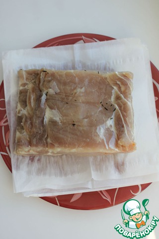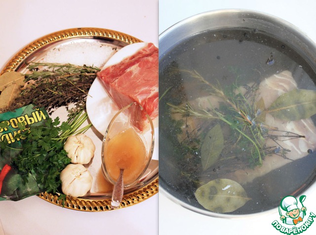 Сначала готовится рассол. На два литра воды нужно взять дюжину лавровых листов, 6 ст. л. меда, 3 веточки розмарина, 12 веточек тимьяна, столько же веточек петрушки, 2 головки чеснока. Чеснок нужно прямо со шкурками раскромсать плоской стороной ножа. Кроме того, понадобятся 2 ст. л. черного перца горошком и 100 г крупной морской соли. Все это нужно довести до кипения, дать повариться, пока не растворится сахар, после чего остудить. Надо отметить, что запах на этой стадии - уже сказочный.