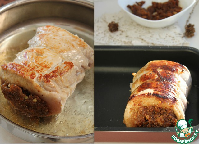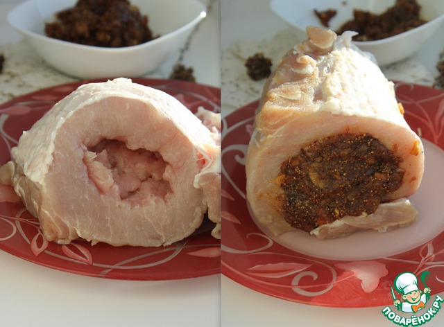 В свиной шейке делается надрез таким образом, чтобы создать нечто вроде глубокого кармана. В карман закладывается фарш, кусок мяса перевязывается кулинарной ниткой. Вязать нужно аккуратно, чтобы начинка не вылезла наружу.