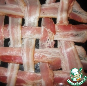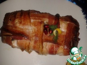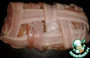 • Кусочки филе разложить на пленке, на них положить готовые грибы с луком и свернуть в рулет так, чтобы грибы были полностью закрыты. Поместить подготовленный рулет на коврик из бекона.