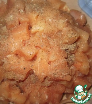 • Филе курицы нарезать мелкими кусочками, посолить, поперчить