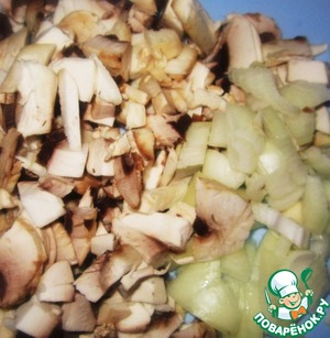 • Грибы и лук нарезать и обжарить на сковороде до готовности.