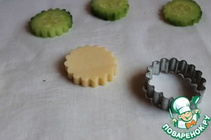 Режем огурец на шайбы. Сыр тоже нарезаем, толщиной примерно 0,5 см. И выдавливаем формочкой такие цветочки. Если нет формы, можно сделать это рюмкой.