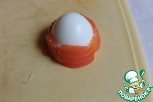 Яйца разрежем пополам. И тут я взяла только одну часть яйца, которая у нас заостренная (можно взять перепелиные яйца). Рыбку режем на тонкие полоски и завeрнем вокруг.