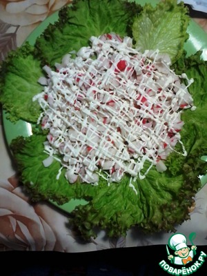 Выкладываем крабовое мясо на листья салата.