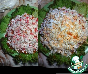 Затем режем оставшуюся половину крабового мяса и яиц, чередуя майонезной сеточкой (то есть повторяем первый и второй слой)