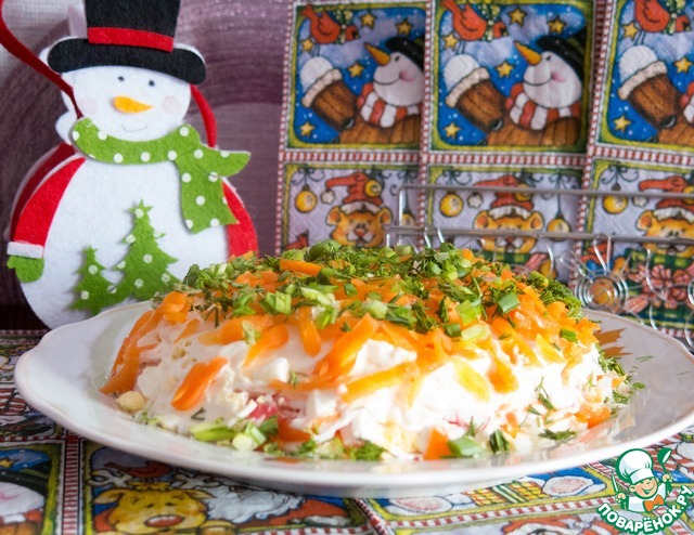 И в завершении трем вторую половину моркови, выкладываем ее на верх и украшаем майонезом, зеленью или как разыграется Ваша фантазия. Оставляем на пару-тройку часов в холодильнике, чтобы салат пропитался. Bon appetit
