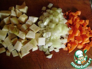 1 луковицу, морковь и сельдерей режем кубиками и добавляем к мясу. Также всыпаем перловую крупу и варим суп на среднем огне до готовности. Солим, перчим и кладем специи по вкусу (лавровый лист, перец горошком, душистый и т. д.)