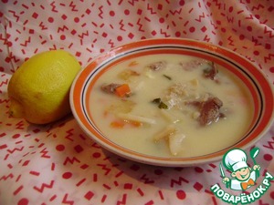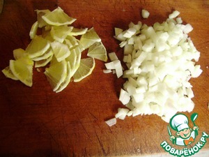 Оставшуюся луковицу мелко измельчаем. Половинку лимона режем на тонкие дольки. Добавляем все это в суп за 5 минут до готовности.