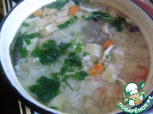 Зелень мелко нарезаем и также добавляем в суп и даем пару минут прокипеть.