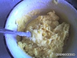 Холодную сковородку смазать маслом, посыпать мукой или сухарями.